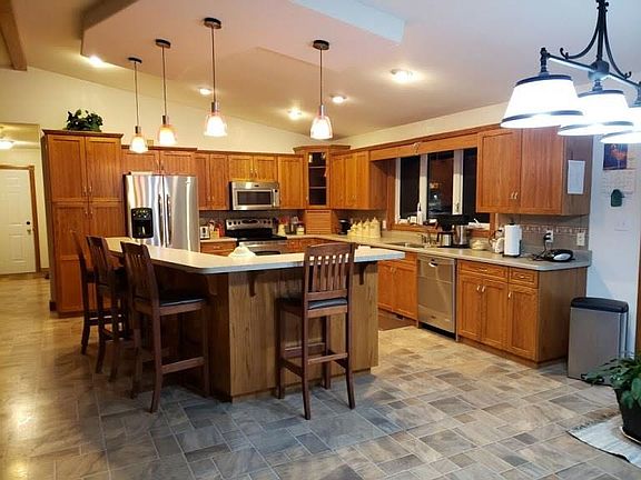 This is a gorgeous 4 bedroom 3 bath Canadian home on 4.93 Acres of land with a shared private well. The kitchen features beautiful oak kitchen cupboards with pull out drawers in each cabinet, an island, and open concept dining, living and kitchen area. The dining room also has access to a composite deck through french doors. The living room has an office attached to it that has a built in desk with shelves. The master suite is complete with a spacious bathroom and walk in closet. The basement includes a giant craft room with shelving and extra storage space, a large storage room, 2 spacious bedrooms, a bath and a very large family room. This home includes an attached heated 2 car garage and finished cement patio out front. Please call for a showing or any questions.
