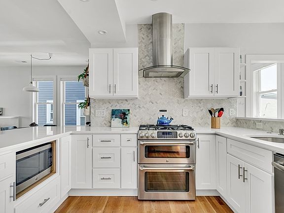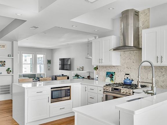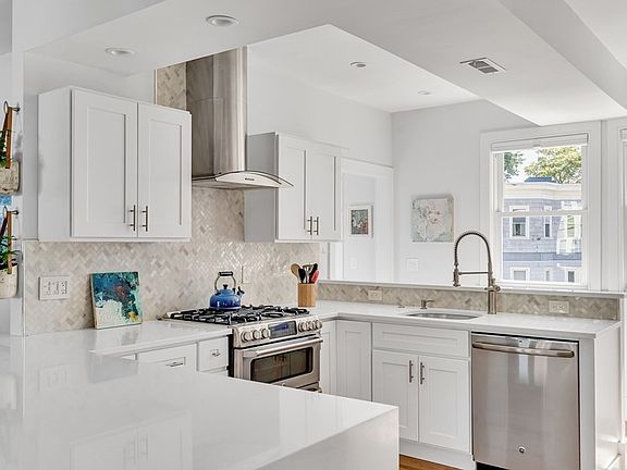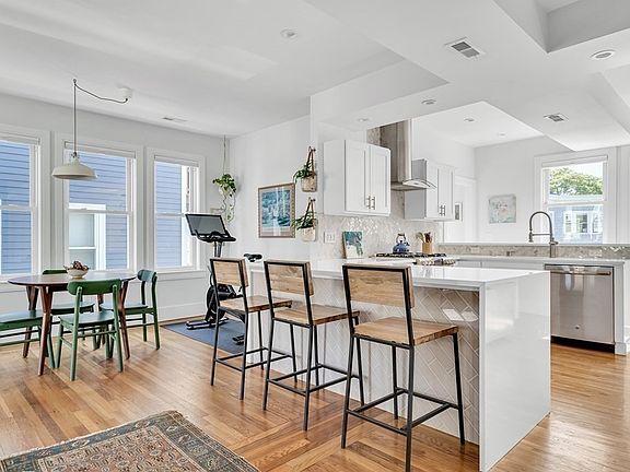 A clear standout—located in the desirable Adam's Village neighborhood. This recently renovated two bed, two bath 1255 sf condo features an open and spacious layout. A chic chef's kitchen is the centerpiece finished with white quartz countertops, waterfall peninsula, herringbone Carrara marble backsplash and GE Cafe Series appliances are just a few of the amazing features. Every room is bright and cheery with wonderful light coming in from four exposures. There's a spacious primary bedroom with en-suite full bath and an equal sized second bedroom. The two full bathrooms are beautifully finished with custom glass shower doors and Italian tile work. Other features include: 2017 HVAC, in-unit laundry, a four-season porch, basement storage, 1 off-street parking space and a private deck. Minutes to the Ashmont Red Line station or Cedar Grove trolley stop, Neponset River Greenway Trail, parks, newly renovated public library, wonderful restaurants, cafes and coffee shops. Offers due Tue by 12.