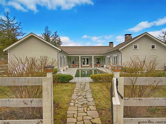 WIDE open Millbrook mountain and pastoral VIEWS are magnified from the mahogany sheltered entry front porch that beckons a dinner party while watching the famous sunsets but also invites serenity. If that isn't enough space relax then enjoy the views from the side patio or the back expansive veranda with ceiling fans opening up to the magnificent gunite lap pool and exquisite perennial gardens and flowering trees. This is a beautifully detailed TRUE (the Rolls Royce) craftsman style home that lives larger than it's 2670 sq. ft. Upon entry, guests are greeted with beamed cathedral ceilings adding visual interest to the space and uninterrupted views thru to the impressive gathering room that looks clear thru to the magical courtyard & pool. A kitchen that has room for multiple chefs to work and offers minimal walls allowing the line of sight to view all living areas including the raised hearth river stone fireplace that warms you on the chilly spring evenings. A series of french doors from great room, MBR suite & guest wing allow you to access the outdoor courtyard, heated lap pool & covered porch to sit under during the rain, providing ideal space for social gatherings. Master suite is a luxurious retreat with another raised hearth stone fireplace, walk in closets, huge bathroom with deep jet tub, glass shower, his and her sinks and private access to pool. The guest wing offers 2 stunning bedrooms w/shared marble tile bath & angled ceilings creating architectural interest and access to pool. Your family and friends will never leave once they spend time enjoying the separate art studio with gym, family room & screen porch at the back of the separate studio that is steps away from a generous size pergola and abundant nature. If that isn't enough then you have an additional attached art studio w/hot & cold water, cathedral ceilings so you can explore your creativeness. Many features and details require you to come sit and feel the pleasure this home brings to many! ONE OF A KIND property & home in Gardiner