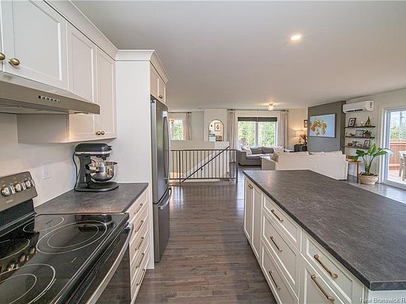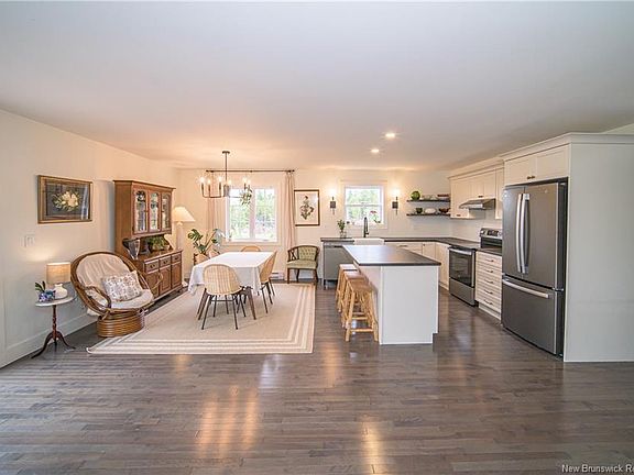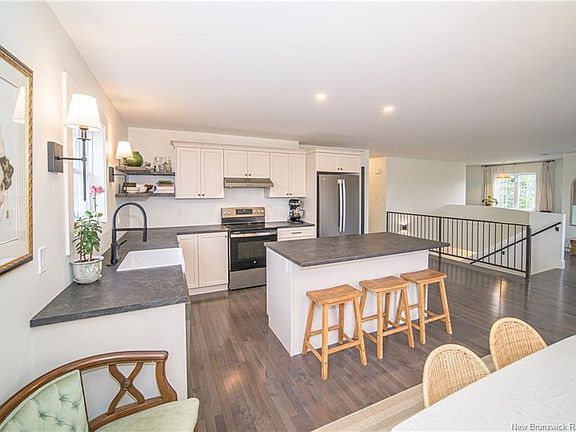 Nestled in a welcoming family neighbourhood, this custom built home sits on spacious lot, offering peaceful rural setting just minutes from Fredericton. Discover bright, open-concept main level where living, dining, and kitchen areas flow seamlessly together. Beautiful kitchen features classic white cabinetry, large island with seating, and farmhouse-style sink. Just off the kitchen, fabulous walk-in pantry offers ample shelving, counter workspace, and prep sink - ideal for the home chef or entertainer. From dining area, step out onto a private deck overlooking mature trees - perfect spot for morning coffee or evening BBQs. Primary suite - retreat with its rich, cozy tones, generous walk-in closet, and spa-inspired ensuite featuring double vanity with vessel sinks, tiled walk-in shower, and warm brass fixtures. Two additional bedrooms, full main bath, and conveniently located laundry area complete the main floor. Lower level expands the living space with family room, 4th bedroom, 3rd bathroom, and dreamy mudroom off the entrance from attached double-car garage. Two heat pumps for energy efficient heating and cooling. Outside, landscaped yard provides plenty of room to garden, play, or simply unwind in your own private oasis. Every detail of this custom-built home reflects thoughtful design and quality craftsmanship. Easy access to schools, parks, and recreational trails - perfect place to enjoy small-community living without sacrificing convenience.
