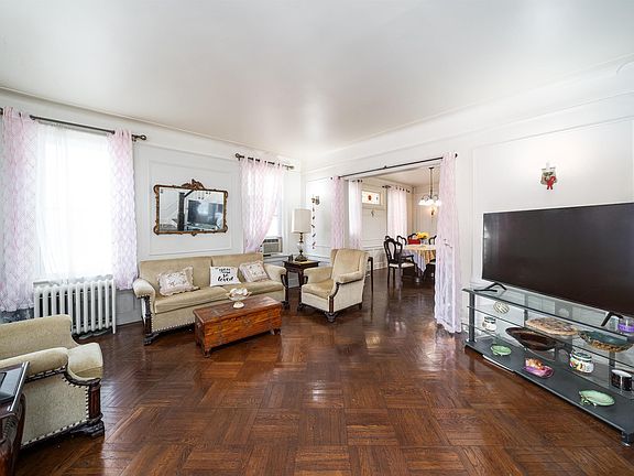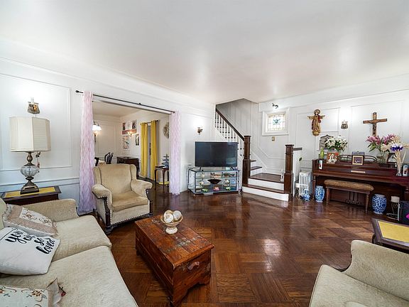 such as the original hardwood parquet floors, French doors, stained glass windows, sconce lightings, decorative moldings, and high ceiling. It also features a spacious living room and a formal dining room, a den or office space with lots of windows, upgraded kitchen, and a half-bath on the first floor. The 2nd floor has three bedrooms and a full bath. The driveway may accommodate parking for up to 5 cars plus a garage currently being used for storage. This property also features a semi-finished basement with a full bath