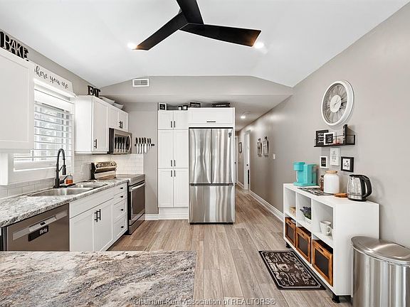 Discover this beautifully refinished mobile home, featuring a fresh and airy decor that will delight you! Situated on a quiet cul-de-sac in St Clair Community Estates, this home offers a fully fenced yard, perfect for kids, pets and privacy. Enjoy the spacious open concept layout, highlighted by vaulted ceilings and pot lighting throughout. The eat-in kitchen boasts stainless steel appliances and updated cabinetry, while the generous master bedroom includes a full 4-piece ensuite. Additionally, there's a spacious secondary bedroom and a second full 4-piece bath, making this home designed for comfortable living. Step through patio doors onto a large, partially covered deck (31 x 10), providing a serene space to relax. Updates include a newer furnace, air conditioner, hot water tank, and steel roof, ensuring peace of mind for years to come. Two 7 x 7 storage sheds offer ample space for your outdoor gear. Park approval is required, and the monthly land rental fee will increase by $50 upon sale. This fee covers taxes, garbage pickup, and snow removal on the road. Don’t miss this opportunity for comfortable and convenient living—call today to schedule a viewing!