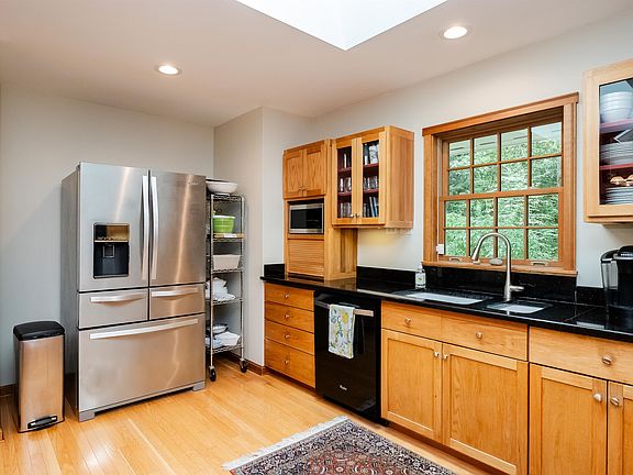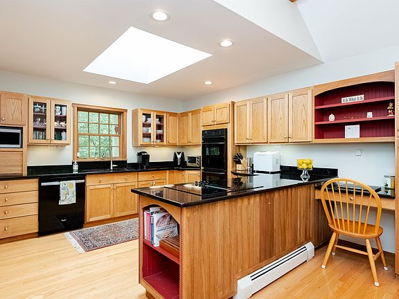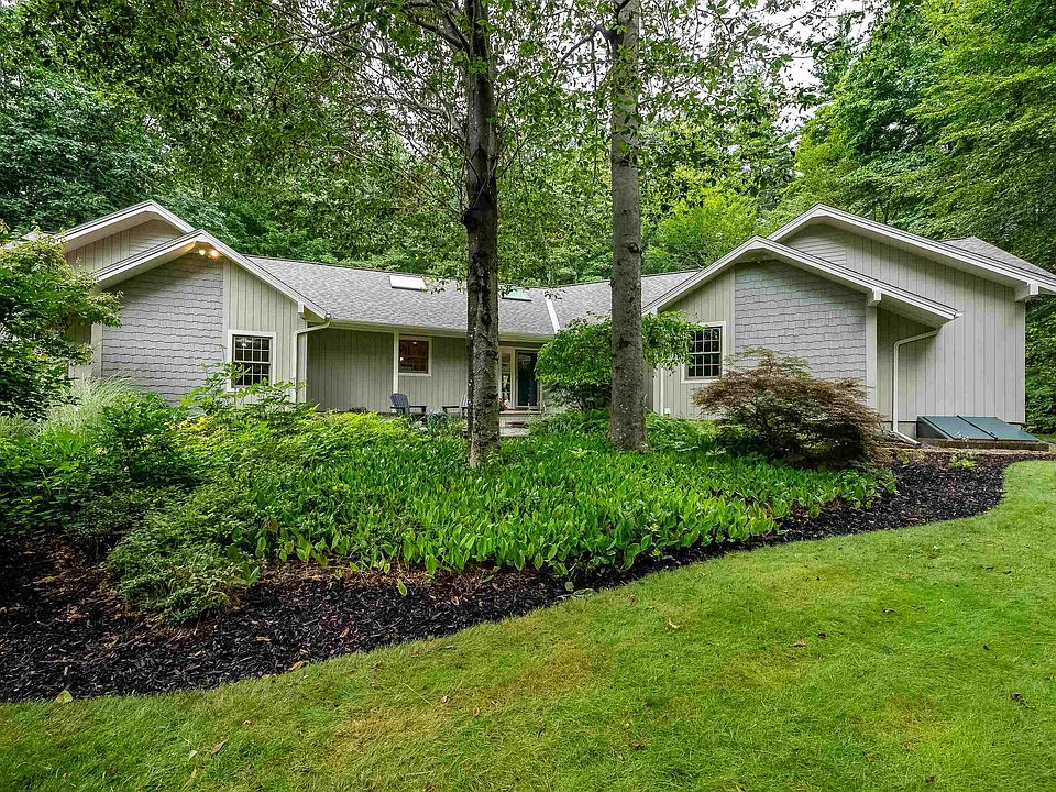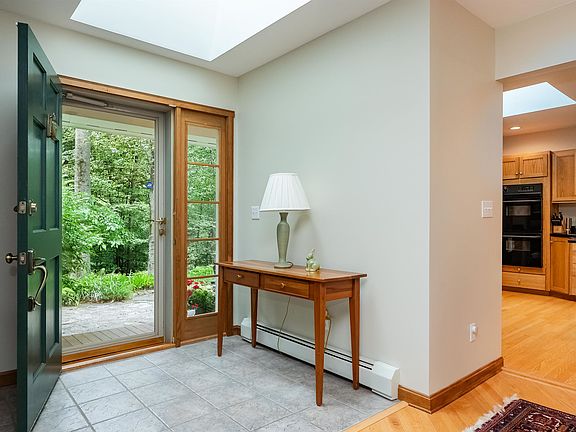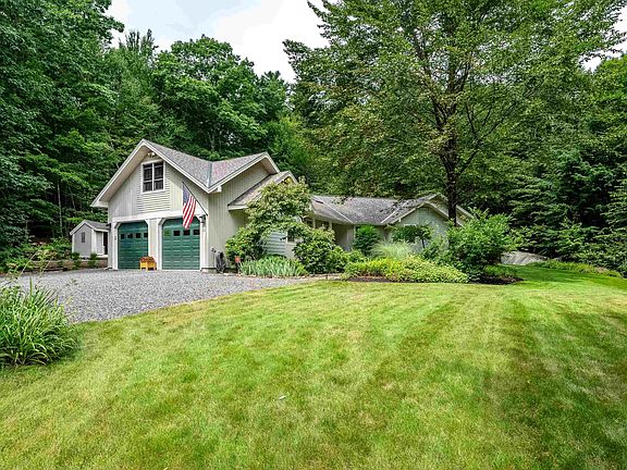 Custom contemporary ranch framed by stonewalls & lovely landscaping tucked back on 1.86 acres. Privately sited & filled with light, this fabulous home is brimming w/custom touches, contemporary flair & open space for living, working & play. The fabulous cook's kitchen boasts lots of cabinetry, lots of granite counter space, under cabinet lighting, double ovens & separate cooktop, skylight, cool message center & open to perfect dining area w/vaulted ceilings. Step into the 3 season porch & you will find a way to enjoy year round. The focus of the home is the awesome LR w/custom floor to ceiling fieldstone FP & windows on all sides w/slider to the spacious deck. The primary suite has it's own small deck & lovely bath w/tiled shower, jet tub & double vanities. The 2 additional bedrooms have hardwd & the full bath is charming as well. Convenient laundry closet has a utility sink. Adding to the charm & function are the lovely entry foyer & the mudroom accessed through the garage. Hardwd floors thruout most of this home, lots of windows newer skylights, natural woodwork & freshly painted walls, you'll just want to move right in. The LL/basement has 2500+ square feet for utilities, workshop, storage & future living/rec space. Well maintained, FHW oil heat, radon mitigation system, generator ready & more. Potential living space on 2nd flr accessed via garage. Enjoy the outdoors - generous deck, farmers porch, patio & firepit & 3 season porch & lovely plantings. Welcome Home!