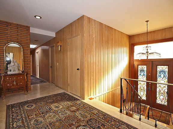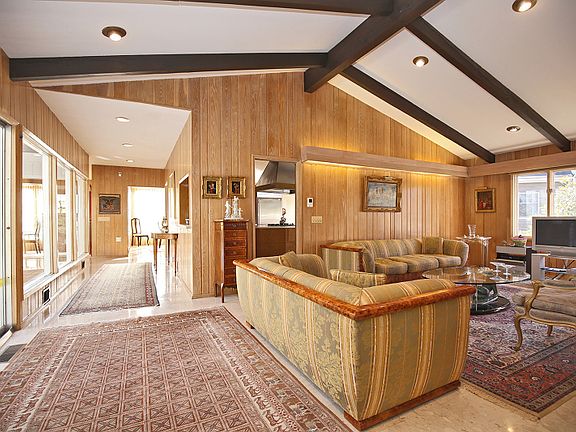 This sprawling Northside Mid-Century Modern Ranch embodies the essence of its distinctive architectural style, with an emphasis on lifestyle, soaring open living spaces and abundant windows that capture its natural environment, enhanced with sleek materials composed of glass, steel, woods and stone. For the aficionado of modern contemporary, this is the place to call home! Spacious sun-drenched rooms set beneath soaring beamed sky-lit ceilings and walls of glass anchored on marble floors wrap themselves beautifully around a four-season solarium with sunken koi pond that overlooks a lovely free-form in-ground pool framed with lush private surrounds. A see-through glass-front gas fireplace set in a wall of sleek travertine marble in both the living room and family room, uniting the two rooms; the formal dining room has a wall of built-ins hidden behind a façade of modern motifs and a bank of windows. Windows surround the kitchen and breakfast area with a center island poised beneath a skylight and high beamed ceilings. A wet bar complete with undermount beverage fridge features a pass-through window to the solarium for entertaining, while a laundry room off the kitchen adds convenience. Three bright bedrooms reside on the main floor for easy Ranch-style living, set along a hallway that enjoys a skylight, recessed drawers and large linen closet. Two of the bedrooms are ensuite with skylights and private baths, while the master suite enjoys secluded pool views, as well as two walk-in closets and a master bath that features a double vanity and step down open shower. An office/den on this level adds versatility, with a powder room located nearby. The expansive lower level recreation room enjoys abundant natural light, wall-to-wall carpeting and offers additional leisure living space. A large fourth bedroom and bath with shower add versatility -- perfect for guests! There is also direct access from the driveway and the oversized three-car attached garage (two car plus a tandem). Generous storage rooms are a plus. Unique in every way and ideally located close to town and New York City commuter trains in the Lincoln-Hubbard Elementary School district, this Northside home is a rare Summit gem.