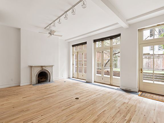 The unit comprises the garden level, second floor, and 1/3 of the third floor of the townhouse. The garden level is the heart of the triplex. The great room is a generous expanse divided by original columns. There is natural separation between the open kitchen and the living and dining areas, complemented by ceilings 10.5 feet high. The great room gazes into the backyard through glass-paneled doors. With lovely trees and privacy fencing, the garden offers ample room for dining and recreation.