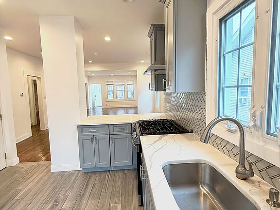 welcome to this fully renovated, sunlight filled first floor, three bedrooms, one bath apartment on a great location in town. Apartment features central air AC , hardwood floors throughout, open floor plan with huge living room, dining room and kitchen area. Kitchen features plenty of cabinet space, stainless steel appliances, and a walk out to a private backyard with its own deck, ideal for gatherings and family evenings. Three good size bedrooms, each with a closet . a full updated bathroom with a tub finishes up the space. Laundry is in the basement where you can use for extra storage as well. Amazing location, close to public transportation, restaurants, parks, school, and much more. Also, this apartment offers a very long driveway that fits up to five cars. Landlord pays water. No pets.