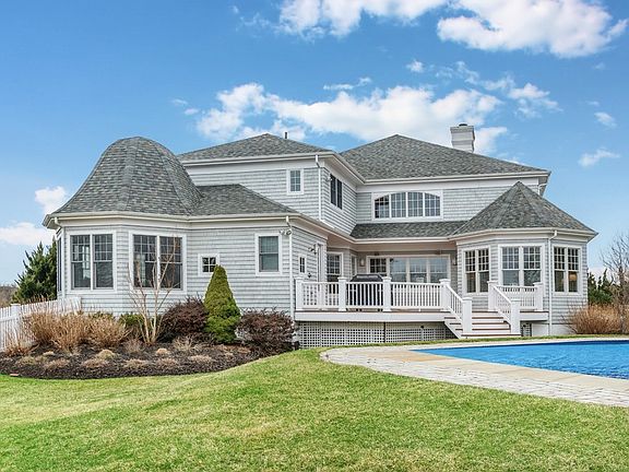 This sun-filled post modern with bayviews sits high and dry above sea level on a quiet road just a short walk from the famous pristine beaches of the Atlantic Ocean. Think of Gone With The Wind's Tara moved to the Hamptons! Built in 2007 with floors of Brazilian cherry, designer chandeliers, double moldings and exquisite tile work, this art-filled 6700 square foot home is both elegant and warm. The cathedral-ceiling living room features multiple windows, a cozy gathering of comfortable seating around the stone-faced fireplace, a striking cherry-wood bar with granite counter and brass pub-rail in one corner, and a grand piano tucked quietly into another corner. A first floor master bedroom with his and her bathrooms, formal dining room entered through round pillars, library, designer kitchen open to its own den, and a breakfast room complete the downstairs. The second floor features an open den and four en-suite bedrooms, one of which is large enough to be an entertainment room with pool table. A three-car garage and heated gunite pool with raised viewing deck complete this exciting and desirable property.