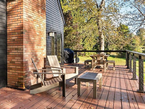 Cozy up by the wood-burning fireplace in the expansive living room, where sliders invite you to the large wrap-around Trex deck—ideal for sipping morning coffee or enjoying sunset cocktails. The open flow from the living room to the dining area and kitchen makes entertaining a breeze. The fully finished lower level offers bonus space for leisure, set up as a fun game and TV room with direct access to the side yard. The large yard presents endless possibilities for gardening, recreation, or crafting your outdoor oasis. Unwind in the hot tub surrounded by rolling acres, a charming frog pond, and breathtaking views.
