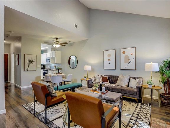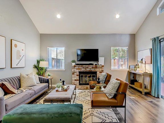 Enjoy downtown Pleasanton living in this move in ready corner townhome. Open floor plan with vaulted ceiling in the living area, recessed lighting, 2 bedrooms with ceiling fans in each and 2 full baths. Kitchen with cool pot rack, laminate flooring, granite counters, stainless steel appliances and recessed lighting. Both bathrooms have been updated. Nicely landscaped back yard with stamped concrete patio and grass area. Park in the detached garage. The HOA covers exterior maintenance and pool/spa area. New HVAC, backyard fence and recently painted.