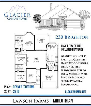 BEAUTIFUL NEW GLACIER CUSTOM HOME located in the desirable Lawson Farms addition. This 2216 sqft Energy Efficient home has Handscraped WOOD Floors & Ceramic TILE. OVERSIZED GOURMENT KITCHEN has GRANITE Countertops with STAINLESS STEEL APPLIANCES. All bedrooms are LARGE and it has a large STUDY. The back of the house has a 18X17 COVERED PATIO. Don't Miss This! This is a BEAUTY!! COME SEE TODAY!