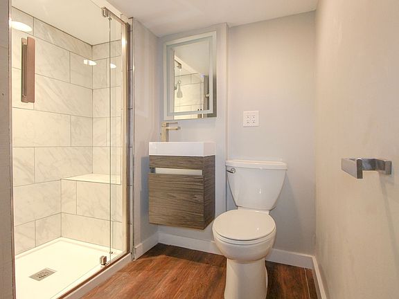 New drywallContemporary stainless steel appliancesTiled showerTouch-activated led mirrorUpdated appliancesNew vanityGorgeous marbled quartz countertops