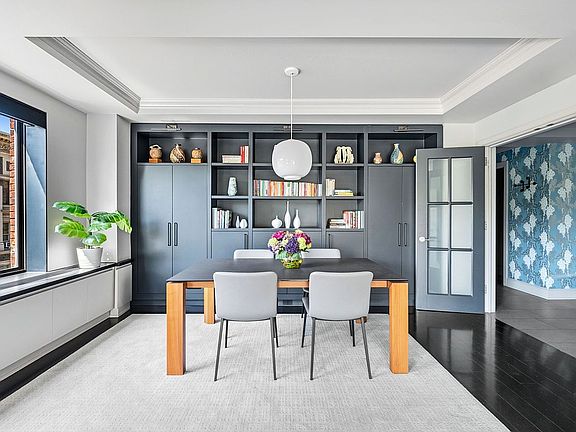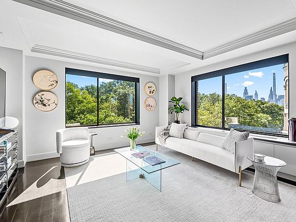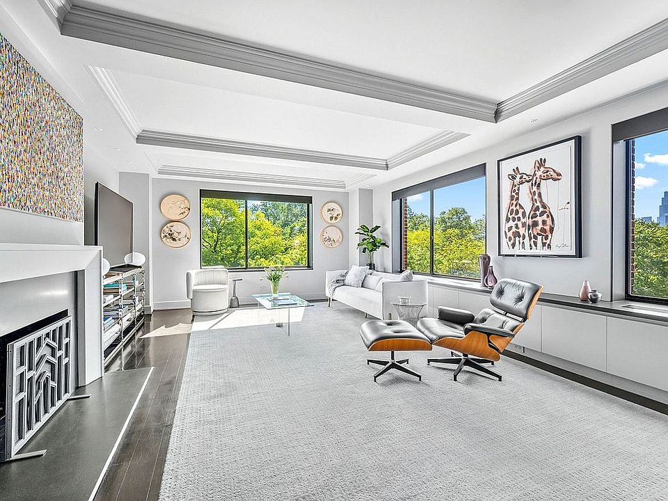 The sun-drenched formal expanse reaches nearly 30 feet and is surrounded by Central Park views from every picture window with both south and east exposures, drawing in fabulous natural light. There is a wall of custom-built ins, a wood-burning fireplace for cozy winter nights, and plenty of room for formal dining.