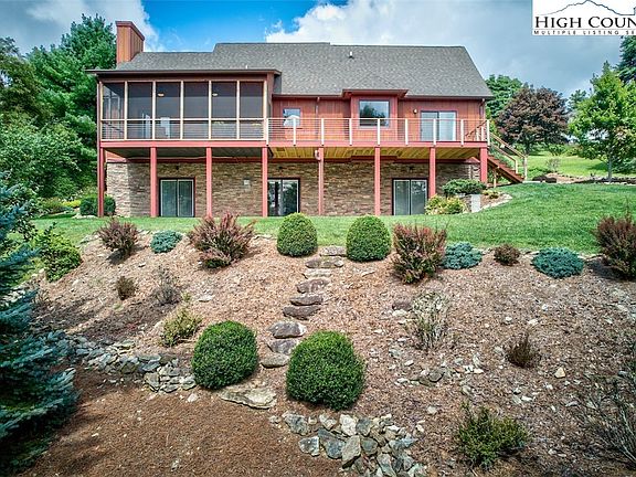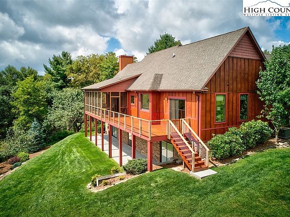 This Arts & Crafts-like, rustic contemporary home radiates exquisite quality, natural, bright and airy aesthetics, conveniently minutes from charming Blowing Rock shops and the amenities of Boone. With cedar panels and shakes outside and engineered-truss construction, it's a solid beauty. The walnut cabinets in both kitchens and walnut wainscoting are a deft touch. Master on the main assures one-level living. Cathedral ceilings above and nine-foot ceilings in the expansive lower level with kitchenette provide architectural space. All bedrooms boast en-suite baths and private access to the deck and patio for your company. Think three master suites! Gourmet kitchen gleams with stainless appliances, granite, deep sink. Hardwood floors resonate quality. Perched on park-like, gentle lot with mature apple trees, you're surrounded by panoramic feathered views yet close to town! Both the fireplace and lower level gas stove are vented for air quality. Feels almost new with tasteful, rustic hue modern interior paint scheme and exotic, solid wood, two-panel doors and trim. Covered screen porch with huge patio below bring mountains to you. 2-car garage and low utility bills make life easy.