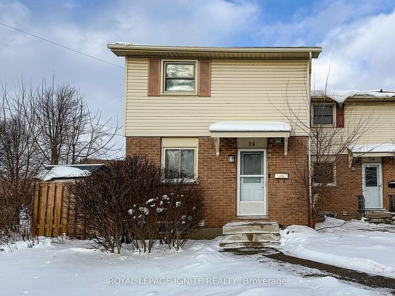 Welcome to Unit 26 at Sunrise Village, a rare 2-storey End unit that has been meticulously transformed from top to bottom. This3+2 bedroom, 3-bathroom home offers over 1,100 sq. ft. of modern living space, featuring high-efficiency forced air gas heat and central AC-A premium upgrade for this community. The bright, open-concept main floor flows seamlessly into a private, fully fenced outdoor patio, perfect for summer entertaining. The finished lower level is a versatile sanctuary with two lounge spaces modern 4-piece bathroom, walk-in shower. Located steps from Argyle Mall, Near Fanshaw Collage, Top schools, and transit, this move-in-ready gem offers sophisticated living with low maintenance fees ($345) that include water and two parking spots. Don't miss the best-positioned unit in the Complex, making it an ideal choice for both savvy investors and first-time buyers.