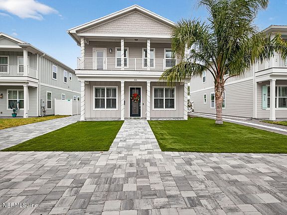 Recently built coastal home offering modern design and relaxed beach living located just steps from the ocean and a short walk to Beaches Town Center. A flexible floor plan with primary suite options on both levels. Open kitchen with white shaker cabinets, granite countertops, and stainless steel appliances. Plank tile flooring on main level. Covered front and rear balconies provide outdoor living spaces. Built for efficiency with Low-E windows, spray-foam insulation, Hardie Board siding, and a metal roof. Brand new brick-pavers have been installed in the driveway and exterior walkways. A detached two-car garage set up for EV charging (charger not included) is located behind the home. Brand new artificial turf was installed in the front yard. The design for the approved swimming pool is included in the pictures.