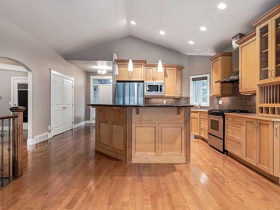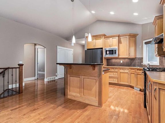 With an open-concept layout and vaulted ceilings, the main living area is flooded with natural light, creating a warm and inviting atmosphere. A cozy gas fireplace anchors the spacious living room — perfect for relaxing evenings at home. The kitchen features granite countertops, stainless steel appliances, and a large island — ideal for entertaining or casual family meals.