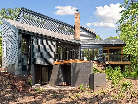 Beautiful modern home on a private lot on a dead end culdesac that adjoins nature preserve/park. Fully wooded lot with tons of wildlife that can be enjoyed from one of the 3 decks or screened porch. Like new construction home that has been professionally rebuilt with high end amenities and finishes. Gourmet cooks kitchen with gas range, kitchen sink with large picture window, huge island, tons of cabinets, and beverage bar with wine fridge. Formal dining room and casual dining area with cozy sitting area off the kitchen. Two story great room with tons of natural light and gas fireplace. Natural wood floors throughout the main level. Upper level has large master bedroom with private deck, huge walk in closet, and beautiful master bath with custom tile shower and double vanities. Walkout lower level with additional bedroom, family room, sauna and 3/4 bath. All new mechanicals, plumbing, electrical, windows, roof, siding and more. Main level laundry/mudroom off garage.