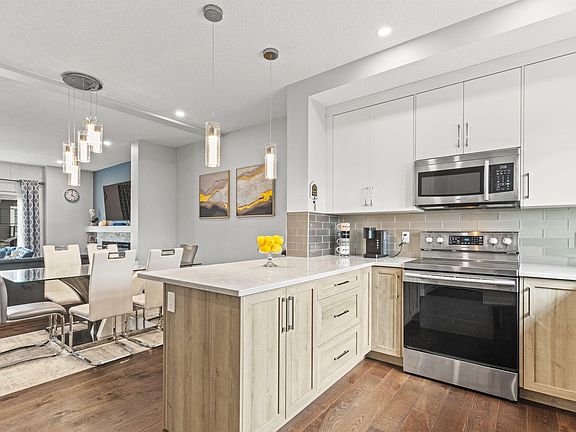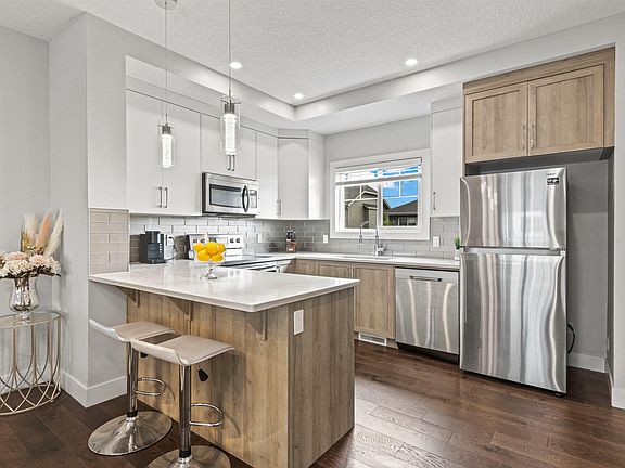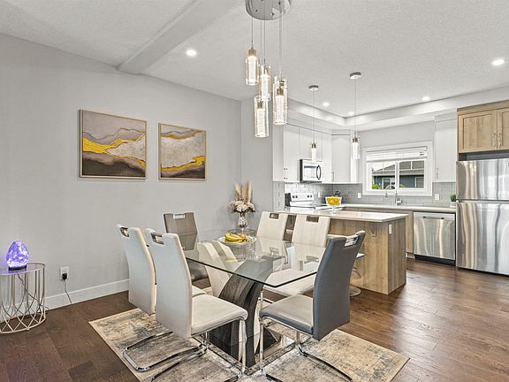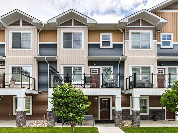 Luxurious and spacious 1676 sq ft townhouse with a double attached garage. This 3-bedroom + den, 3-bath home features stunning 10-ft ceilings and hardwood floors on the main level. The bright kitchen has quartz countertops, stainless steel appliances, a pantry, breakfast bar, and a sunny south-facing window. The dining area flows into a living room with a built-in wall unit, electric fireplace, and access to a large balcony overlooking the courtyard. A convenient laundry room with cabinets and a powder room complete the main floor. Upstairs, the primary suite is set with a walk-in closet, custom shelving and a tiled ensuite. Two additional bedrooms and a full bath offer ample space. The main floor den, overlooking the patio, is perfect for a home office or guest space. Located in a quiet community near trails, a lake, ravine, and Donsdale Park, with easy access to Henday and nearby amenities. Quick possession available – your dream home awaits!