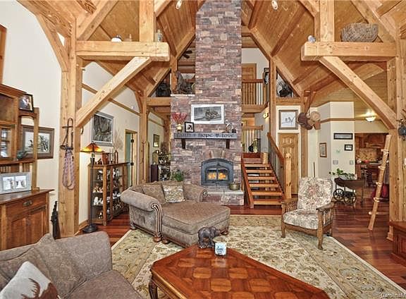 Private and sustainable country living. Sweeping mountain views. Craftsman quality log-post and beam 3 BR 2.5 BA home on 42+ acres. Open floor plan. Great room with soaring beamed ceilings, high efficiency fireplace. Spacious chef's kitchen, top quality cabinetry, granite counters and farm sink. Beautiful master suite on main level with screen porch and hot tub. Gorgeous wood and tile floors. Artistic woodwork and first-class details throughout. Studio. Garden area, shop, barn and sheds. Fenced pastures. Close to whitewater sports, hiking, mountain biking and horseback riding. Near the up and coming town of Marshall with shops, restaurants and breweries. Come to your mountain sanctuary! Listed below Appraised Value!