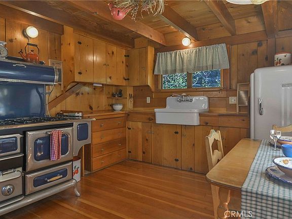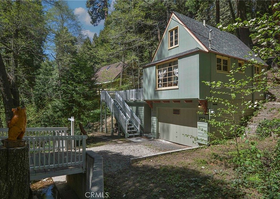 LAKE RIGHTS! Step back in time and fall in love, like i did, with this enchanting 1939 vintage cabin, nestled among the pines and on a seasonal creek. This one of a kind beauty offers lake rights and captures the essence of mountain living from a time gone by. Inside you'll find original wood floors, knotty pine walls, original windows and screens with the original hardware that tell a story of a simpler time. The cozy kitchen is a dream for any nostalgic cook, featuring wood countertops and glass knobs on the drawers, farmhouse sink, the original dutch door to the deck, a reproduction 6 burner range and an eating area overlooking the creek. The main level includes a bathroom, family room with fireplace, main bedroom, and kitchen. Upstairs are two more loft bedrooms. Dont let the square footage throw you off - The main bedroom has a Double bed, Upstairs is a queen bed in one bedroom and a twin in the other. There is a spacious front deck and a side patio to enjoy your morning coffee listening to the creek. Downstairs is a separate studio apartment with its own bathroom and kitchenette ideal for guests or just storage, maybe one day this could be permitted. This location is REALLY close to the lake - zip on down to the entrance of Orchard bay to drop a kayak in the lake. The garage will come in handy and also has laundry hookups. With easy year-round access, timeless style, and close proximity to the lake, this is your chance to own a piece of lake arrowhead history.