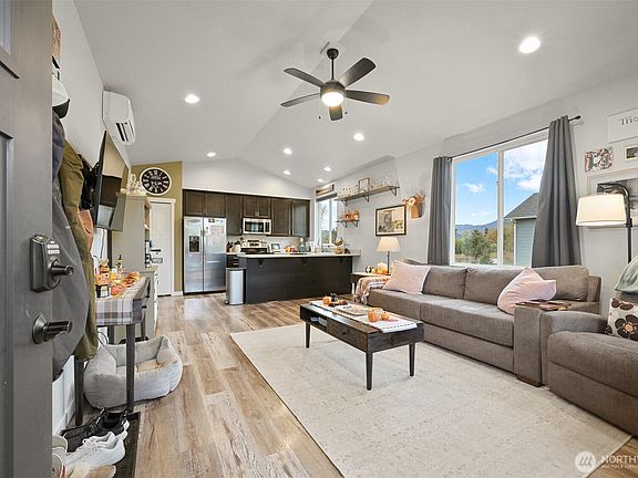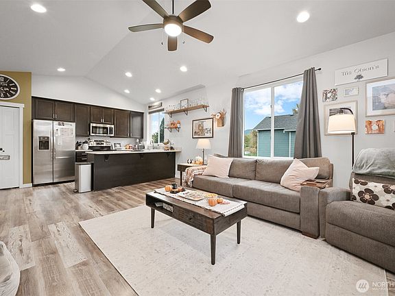 Open-concept great roomLarge fenced yardStainless appliancesGas rangeStunning mount baker viewsQuartz countersFire pit