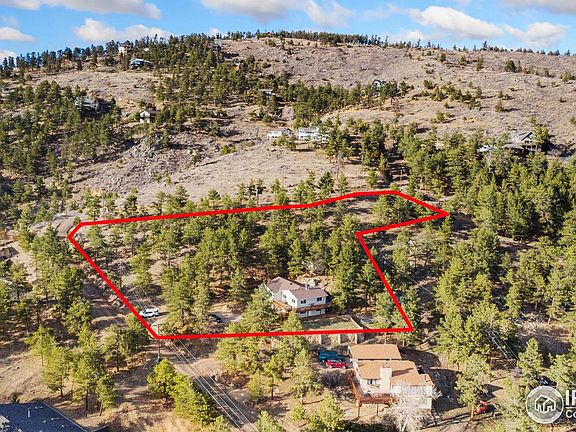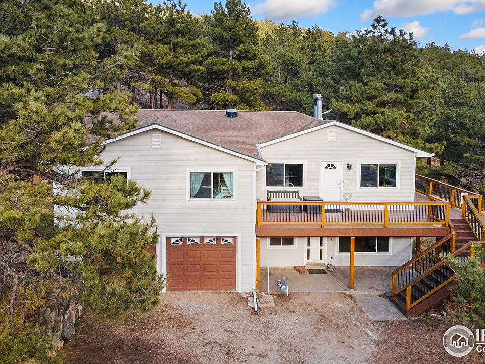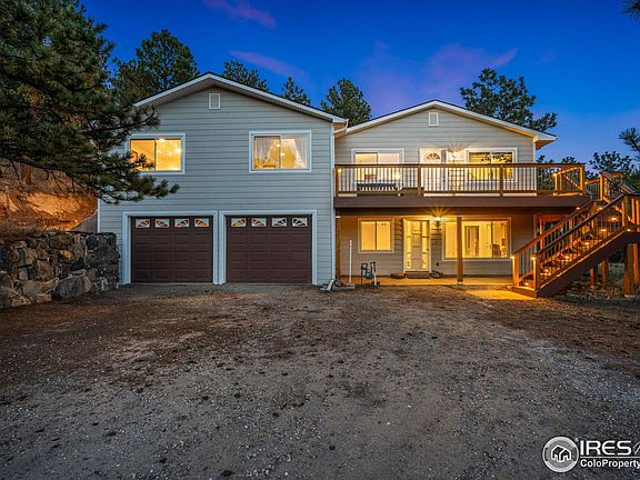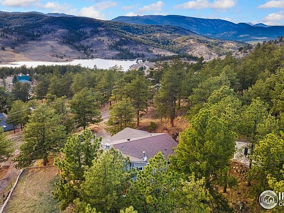 Enjoy breathtaking views in every direction from this private 2 acre mountain retreat nestled on the hillside overlooking Pinewood Reservoir. Not only is the scenery amazing, but the raised ranch home has undergone many upgrades that are sure to impress. The exterior has all new siding as well as a new wraparound trex deck & staircase to the front door. Step inside the bright & open living room with new luxury vinyl plank floors & cozy wood burning fireplace. Beautifully remodeled kitchen with custom alder soft close cabinets, drawers with pull-outs, high end stainless appliances with double ovens, & under cabinet lighting. The Primary suite is masterfully remodeled to include a massive walk-in closet that leads into a luxurious 5-piece "spa-like" bathroom with copper sinks, granite counters, oversized glass shower with pebble floor, & jetted tub with friction heater. Large secondary bedroom with built-in closet shelving has its own full bathroom. The walkout basement with brand new carpet includes a spacious rec room, bedroom, & attached remodeled 3/4 bathroom. Don't miss the detached bonus bedroom/studio with 2 heaters & electricity perfect for hobbies or guests. 2 year old furnace/AC unit, 1 year old water heater, & newly inspected/pumped septic system for peace of mind. Pinewood Reservoir includes a list of activities such as fishing, paddle boarding, kayaking, camping, hiking, picnicking, & more. With no HOA plus a quick drive into Loveland, this property is the perfect blend of remote living while still being close to town.