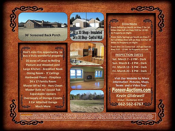 NOTICE!!!!! NOTICE!!!!! NOTICE!!!!!! This property will sell on site at the address listed. The price that is posted on this site (zillow) is not the starting Bid, it is not the sales price, it is not the asking price, it is not the purchase price. This site (zillow) requires a price to be entered into the listing price box in order to list a property for sale. This price $101,111 is just a number and in no way entered with intentions to mislead anyone. This property will be offered for sale at public auction on Saturday, march 21, 2015 at approx. 3 PM CST 25 Miles from Oxford 4 Miles to Sardis Lake Beautiful Home on 20 acres in an Un crowded Area Outstanding Opportunity Auction Saturday, March 21 at 3 PM Beautiful 2872 Heated sq ft Home on 20 ac. of Pasture & Woods Come ready to take advantage of a rare opportunity to Own a Truly Woderful Property. This home has 4 Large Bedrooms, all with Walk-in Closets and the Master Bedroom with a His & Hers. Hardwood Floors spread throughout the home with a hardly walked on look. The 24 x 17 Family Room has a Wood Burning Fireplace and exits onto the 36' Screend Porch that Overlooks the Land. The 2 Car attached garage has entries into the Home and also the Back Porch. The Blacktop Drive Winds around in front of the Home past the 2 Antique Foo Dog Statues and Walkway to the 3 Garages and Storm Shelter. There is a 30 x 30 Workshop that has concrete floors, rollup and walkthru doors. It is insulated and wired. The 24 x 30 Garage is insulated, finished in sheetrock and has Central Heat and Air. There also is an 20 x 20 open end side shed for your tractor and equipment storage. Back in the Home the Kitchen has plenty of cabinets, granite countertops, Glass Cooktop, Oven, Dishwasher and oversize pantry. There is a 12 x 11 Breakfast area and a 12 x 14 Dining Room. The Master Bath has a Jucuzzi Tub, Separate Shower and 2 vanities. The Stairs off of the entry go up to an expandable upstairs with enough room for an office, storage or another bedroom. There is an oversupply of storage with closet space everywhere. There are 9' Ceilings throughout the house. Part of the backyard is fenced for your animals to stay safe too. The land is a combination of open pasture land and woods. If you enjoy watching or chasing wildlife there is plenty of deer and turkey for your enjoyment. The Property is a Short Drive to Oxford, I-55 and Hwy 78. This Home is approx. 2872 Heated Sq. Ft. and Approx. 4231 Total Sq. Ft. Not including the Expandable Upstairs Room Sizes (Rough Figures) Family Room – 24 x 17 Master Bedroom – 18 x 16 Master Bath – 16 x 11 Her Master Closet – 11 x 7 His Master Closet – 7 x 6 Dining Room – 12 x 14 Kitchen – 12 x 13 Breakfast Area – 12 x 11 Screened Porch – 36 x 10 Bedroom 2 & 3 – 14 x 14 Bedroom 4 – 14 x 11 Attached Garage – 24 x 21 Covered Front Porch – 69 x 6 INSPECTION DATES Sat. March 7 – 2 PM – Dark Sun. March 8 – 2 PM – Dark Fri. March 13 – 3 PM – Dark Fri. March 20 – 3 PM – Dark See Documents Tab for a copy of the Brochure and Terms Do Not Miss This Opportunity Address: 230 Hwy 310 Waterford MS 38685 Directions From Oxford go North on Hwy 7 for 14 Miles then left on Hwy 310 for 10 Mi. to Property on Right. From Holly Springs go South on Hwy 7 for 12 Miles then left on Hwy 310 for 10 Miles to Property on Right. From the I-55 Como Exit 257 go East on Hwy 310 – 19 Mi. to Property on Left. Follow the link below for directions from your starting point. http://binged.it/1DrQqeJ
