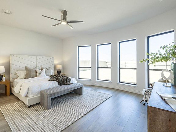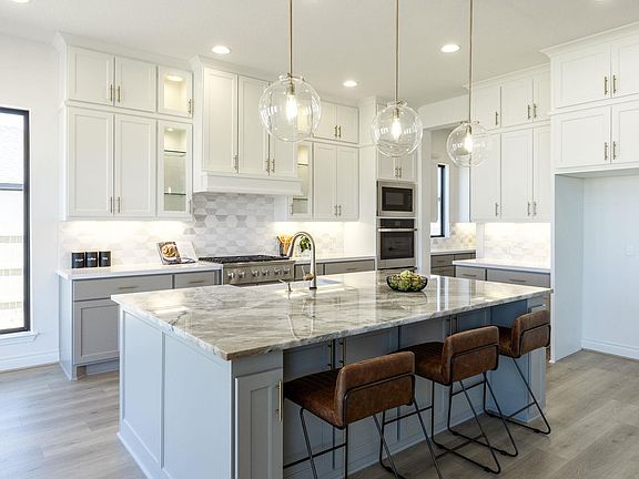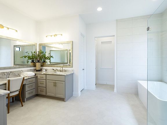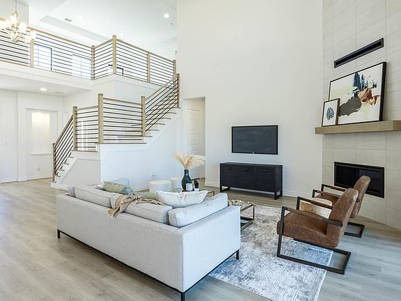 READY FOR MOVE-IN! Private courtyard. Two-story family room with a wood mantel fireplace and sliding glass door. Hardwood floors throughout first floor living areas. Home office with French doors. Kitchen features an island with built-in seating space, double wall oven, 6-burner gas range top, a walk-in pantry and a Butler's pantry. Private primary suite features a curved wall of windows and opens to the patio. Primary bath includes double doors, freestanding tub, separate glass-enclosed shower, dual vanities, a linen closet and a large walk-in closet. Guest suite with full bath and walk-in closet located on the first floor. Upstairs game room and adjacent media room. Secondary bedrooms, a Hollywood bath and linen closets complete this generous design. Mud room. Two-story covered backyard patio and 12-zone sprinkler system. Three-car split garage.