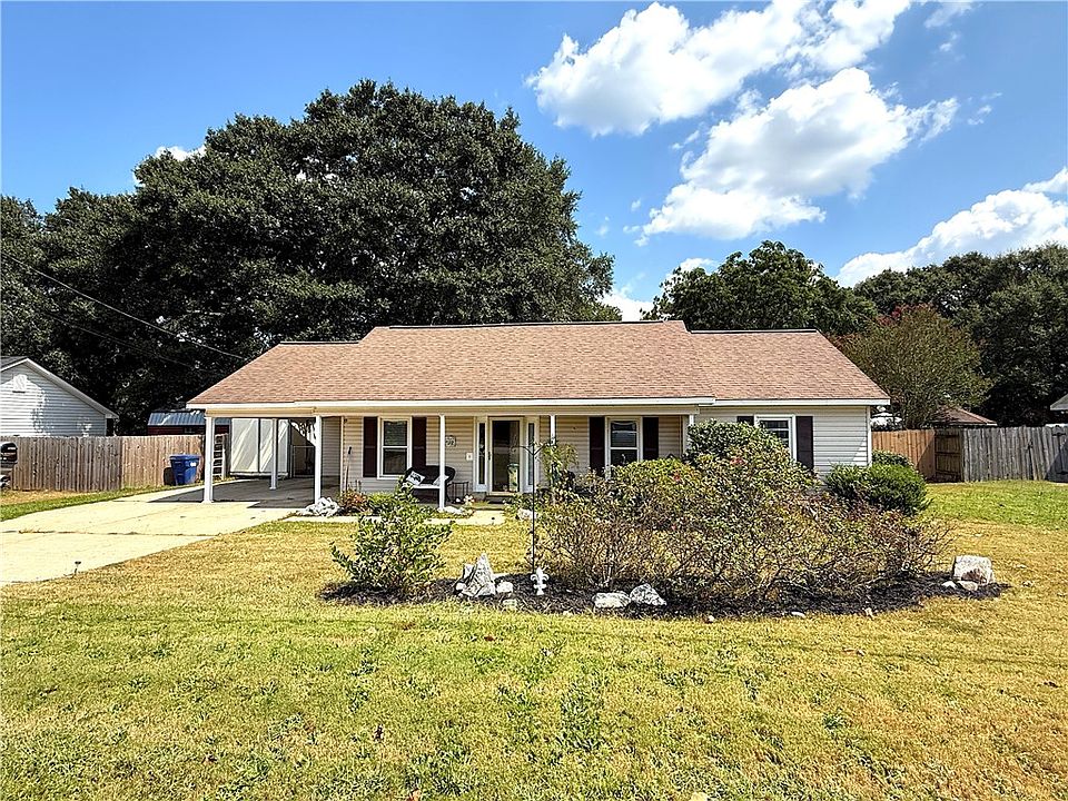 This well-maintained one-story home in Lee County offers comfort, style, and space for both everyday living and entertaining. Situated on a 0.4-acre lot, it features 3 bedrooms, 2 bathrooms, and 1,304 square feet of living space. The open living room has a vaulted ceiling and beautiful shiplap accent wall, creating a warm yet modern touch. The custom eat-in kitchen includes white cabinetry, stainless steel appliances (refrigerator included), a tile backsplash, ceramic tile floors, and plenty of storage space. The flooring has been updated with luxury vinyl plank in the main living area and carpet in the bedrooms. The master suite offers a dual vanity, good-size tub, and separate shower. Inside, you’ll also find a convenient laundry room. The fenced backyard includes a covered back porch, a covered deck overlooking the lower yard, a sprinkler system (front and upper back yard), and a storage shed. So much room to personalize and make it your own. Additional highlights include a one-car carport and a covered front porch. Nestled in a peaceful neighborhood, this home provides plenty of room for kids, pets, and BBQs with family and friends.