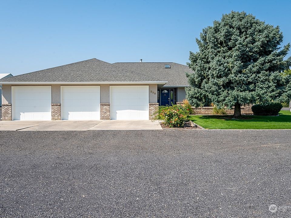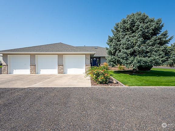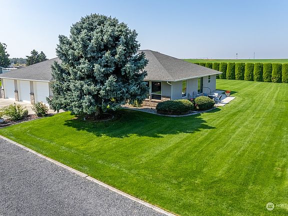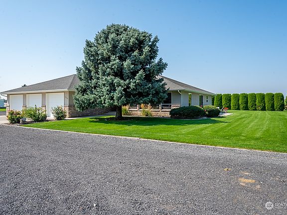 Quality built 2,576 sq. ft rambler on a 1+ acre in desirable location south of Moses Lake. Exterior features: oversized 3 car garage, fully landscaped with mature trees and bushes. Outbuilding with storage space, large covered patio, double pane storm windows, seamless gutters, fresh paint, ample parking for all extra outdoor needs. Stucco siding with brick veneer on front of home. Concrete covering throughout property. RV hookups & clean out. Interior features: tall ceilings throughout, open concept in kitchen, dining and 2 large living areas. One living area with wood stove, one drop drown living room. Large Kitchen island great for entrainment. Primary bedroom with attached bathroom with dual vanity, shower and jetted tub.