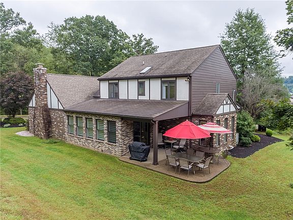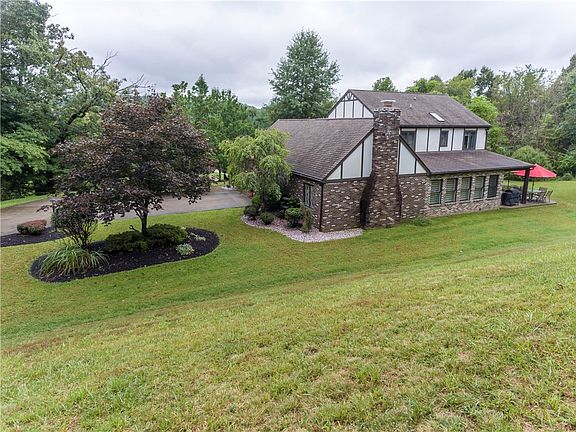 Enchanting 2 story Tudor situated on almost 6 private acres of mature picturesque grounds. Covered front porch and back patio invite you to enjoy nature. Large inviting foyer. Gleaming Brazilian Cherry hardwoods and crown molding adorn the expansive Living/Dining Rooms. Updated Kitchen with abundance of quality cabinets, granite counters, double ovens and large island with seating for 6. 4 season Sunroom surrounded by windows opens to the back patio and private back yard. Spacious Family Rm with wood burning fireplace, built-in cherry shelving and a wet bar with fridge and wall cabinets. Impressive Master with huge walk-in closet and spa-like En-suite with new vanity, countertop and flooring. 2 additional bedrooms and full bath on the 2nd level. Enormous walk-in attic could be turned into 2 more bedrooms/office/gym. Many possibilities for this flex space. Extra-large attached garage off the kitchen for ease in carrying groceries. Full unfinished basement.