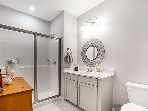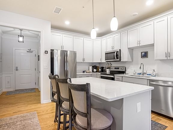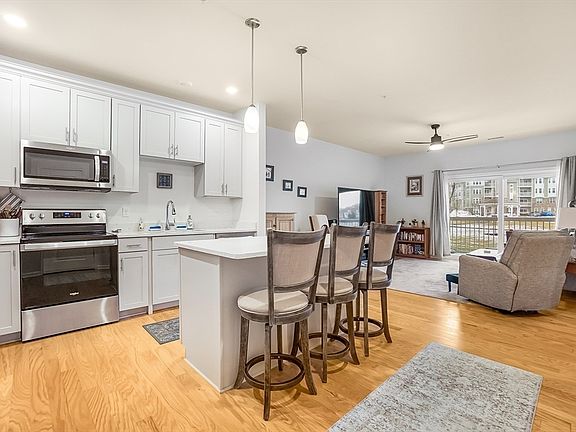 Welcome to your new home in Martin's Landing, a premier 55+ community offering convenience and low-maintenance living. This single-level Moreland-style home is move-in ready, has many upgrades and includes 1 car garage parking. The home welcomes you with a versatile office/den space off the entryway, with French doors for privacy. The laundry room, equipped with a full-size washer and dryer, is conveniently located off of the hallway. The heart of the home is the eat-in kitchen, featuring a large sink, stainless steel appliances, and a spacious island with quartz countertops and bright pendant lighting. The kitchen is designed with 42-inch Sonoma Maple cabinets, under-cabinet lighting, and quartz countertops. Off the kitchen, the large living room has a ceiling fan and access to a private balcony with views of the gazebo and walking court. The bedroom is a private retreat with a ceiling fan, and a large walk-in closet. The large bathroom has a walk-in shower and ceramic tile floor.