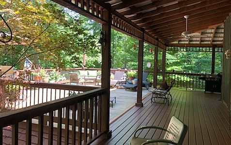 - Exterior: Porch, Wooded Lot, Private Location, Deck, Fence, Wrap Around Deck, Barns, Pasture, Pond, Out Buildings Workshop, Stables