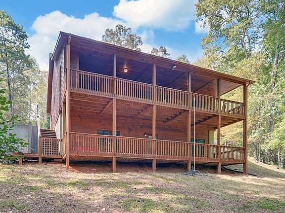 Indulge in the ultimate mountain getaway with this exquisitely appointed luxury cabin, perfectly positioned on over 5 sprawling acres offering unmatched privacy and tranquility. Located just minutes from the charming tri-state hubs of McCaysville, GA, Copperhill, TN, and Historic Blue Ridge, GA. This property defines cabin living. It is an ideal investment for discerning owners or a prime short-term rental opportunity. Step inside to appreciate the warm glow of newly refinished hardwood floors that span the entire open-concept main level, enhancing the cabin's rustic luxury aesthetic. The heart of the home is the expansive great room, featuring soaring ceilings and anchored by a majestic stone fireplace, creating a perfect space for gathering and relaxation. Seamlessly connected to the living area, the kitchen is designed for both entertaining and everyday use. The main level offers unparalleled convenience and luxury with two primary en-suite bedrooms. Each suite provides a private sanctuary, featuring spacious closets and beautifully appointed bathrooms—ideal for multi-couple ownership or accessibility. The fully finished terrace level is dedicated to fun and functionality. An expansive area perfect for movie nights, games, and entertaining guests. Fully equipped wet bar ensures effortless hospitality. A large bedroom and full bath makes this the perfect, comfortable retreat for younger guests. Exceptional Outdoor Living with a massive deck spanning the entire width of the cabin offers stunning wooded views and features a magnificent stone outdoor fireplace—the ultimate spot for al fresco dining and evening conversation. Enjoy the lower private deck as you step out from the game room onto a second large, private deck, ideal for quiet reading or potential hot tub placement (subject to addition).