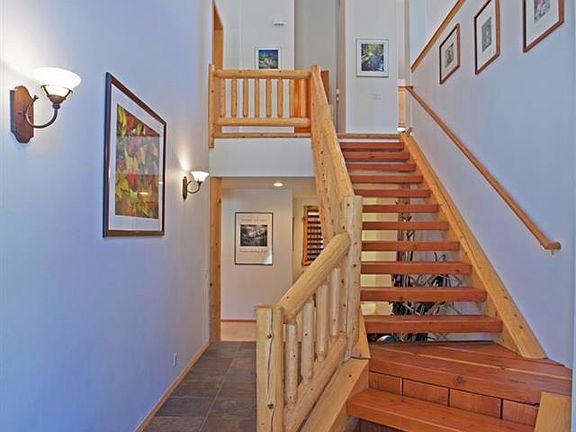 Spacious mountain retreat. Light, bright and south facing. Views from the huge windows. Log accents inside and out. Grand staircase leads to an open great room with vaulted ceilings. Massive stone fireplace and hearth will warm those snowy winter nights. Each bedroom has its own bath. Oversize garage with loft will hold your toys. Slate and hardwood floors. Ample storage. Trex decks, paver driveway.
