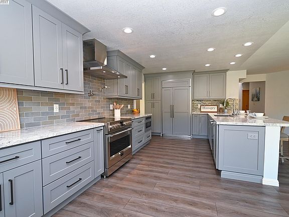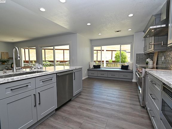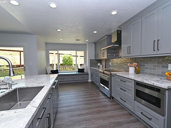 Gorgeous Northwest facing home on a court backing to open space in desirable Canyon Crest! The lovely home features a stylishly updated kitchen featuring new cabinets, quartz counter tops, pot filler over stove, stainless steel appliances, wine refrigerator, quartz bar top, window seat with storage, mixer lift cabinet and so much more. Owned solar saving thousands of dollars in electric bills, plantation shutters, newer dual paned windows, retractable skylight shades, electric retractable awning over primary bedroom balcony, Rachio smart irrigation controller, 1-ton split unit HVAC in primary, and luxury vinyl flooring in kitchen, dining and family rooms. 3 car garage with plenty of storage. The spacious backyard has a newer fence on both sides and deer fence facing open space, paver patio, pergola and fruit bearing pear and apple trees. Walk to award winning Golden View Elementary. Easy access to 680, shopping, trails and the San Ramon City Center. Welcome Home!!