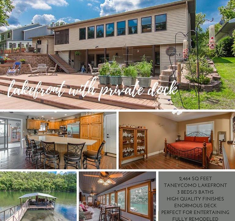 LAKEFRONT HOME WITH PRIVATE DOCK ON LAKE TANEYCOMO! Fully remodeled and it is immaculate! Great open floor plan with beautiful kitchen, stainless steel appliances, corian counter tops and plenty of cabinet space. Lower level kitchen, dining and living room completed with the same high quality finishes. Enormous deck and patio built with trex decking. The waterfront views and mountain scenery are a feast for the eyes. Lots of entertaining space. Convenient location to Branson. It's the triple crown of lake homes!