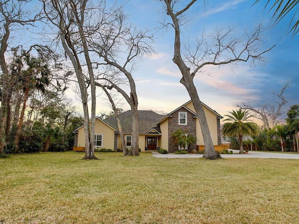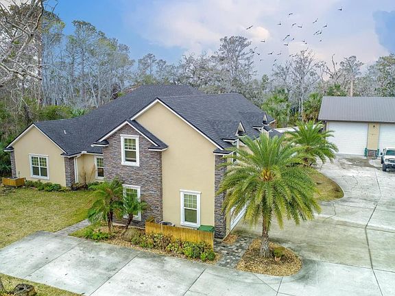 Extraordinary home located on estate-sized 3 acre parcel backing to marsh & Intracoastal. Builders own custom home w/ stunning appointments throughout. Lavish 1st floor master & 3 other BR's down. Upstairs bonus room, BR & BA. Kitchen w/ large island, gas range opens to great room w/ 20' cathedral ceiling w/ exposed beam, floor to ceiling stack stone gas fireplace 2 sets of atrium doors w/ integral blinds leading to outdoor paradise that features a covered lanai, free-form pool w/ flagstone patios & stack stone surround, tiki style summer kitchen w/ wraparound bar w/ cabinets, gas grill, refrigerator, sink & beer tap, 4 wheel drive sport track & 2,000 sq ft building w/ high ceilings & garage doors perfect for boats, RV plus private car storage area w/ AC. Truly you own private retreat.