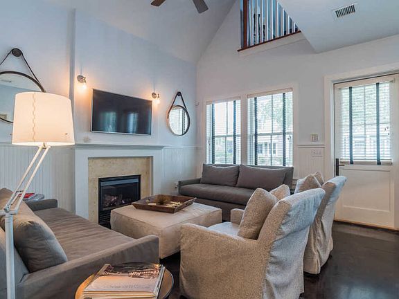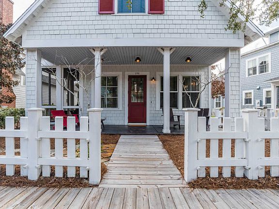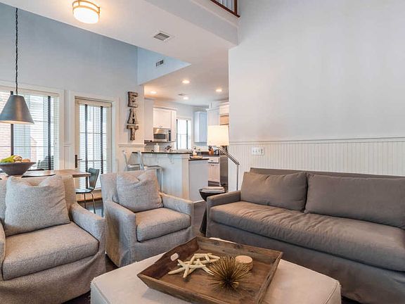 What an amazing 2 bed, 3 bath Florida Cottage in Watersound Beach, and includes a golf cart! . When entering the home, you will be welcomed by the soft blue hues, the beautiful decor and the comfortable furnishings in the spacious great room. The relaxing living room, well-appointed dining room and incredible kitchen are all included in this open floor plan for everyone to enjoy after a fun-filled day at the beach. On the first floor, you will encounter the master bedroom, which is adorned with a lavish king size platform bed that is decorated in dark grey, offsetting the light cream walls. The connecting master bathroom comes complete with a double vanity, walk-in shower and a tub and shower combination.
