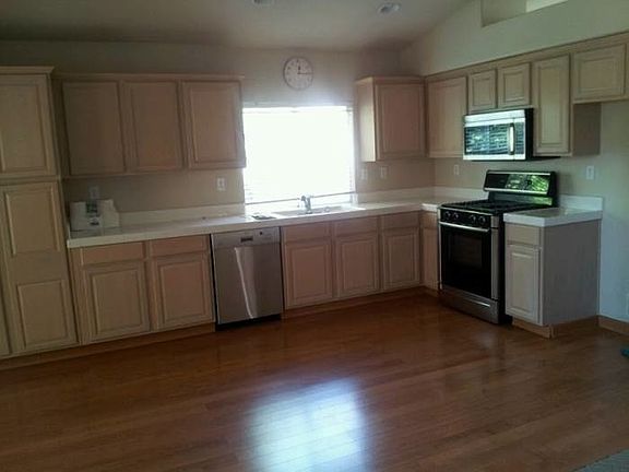 single home with a spacious open floor plan, a 3-car garage and tile roof. Large sunny kitchen with a Stainless Steel Bosch Dishwasher and Stove/oven. Enjoy the cozy wood-burning fireplace in family room. Convenient inside laundry. Covered front patio and porch area. Lattice/Trellis-type cover on backyard patio. Private fenced backyard. Shelves and extra storage in garage. 1 year lease