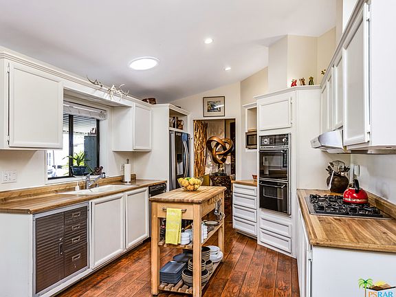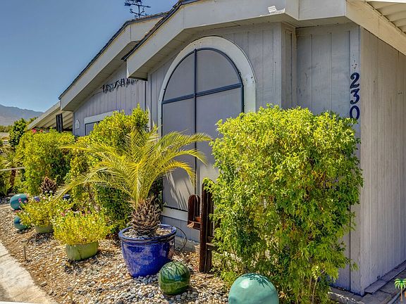 Welcome to The Canyon, a central valley, pristine 55+ Mobile Home Park in the heart of Cathedral City. This 2 bedroom, 2 bath (2 master suites) home has been thoughtfully updated to today's tastes: it has an open, spacious floorplan; a raised, beamed ceiling in the living room; a roomy gourmet kitchen, and lots of light. The flooring boasts beautiful dark wide plank "wood" laminate throughout the living areas and carpeted bedrooms. The Master bedroom is roomy and equipped with a large walk in closet, and the Master bath has double sinks and a large vanity. The kitchen has plenty of cabinet and counter space, double ovens, a 5-burner gas stovetop, stainless appliances including a dishwasher, as well as room for a breakfast nook, if desired. Outside one kitchen door is a well positioned dining area, which flanks the open living room. The front entry features a small ramp with a handrail and a covered, tiled patio. There is also a storage shed at the end of the carport, and a tiled covered patio area under the carport. Last, but not least, there is an Evaporative cooler for the premises. The Park features a large pond, expansive green belts, tennis courts and a huge pool and spa, as well as a clubhouse. The Park requires an approval process prior to residency with a minimum credit score and monthly income. Don't miss out on this beautiful home!