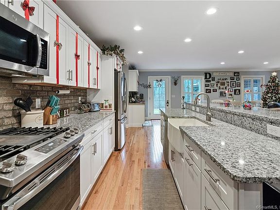 Welcome home! Located in a quiet neighborhood, this colonial sits on over 3 acres of land to provide you the privacy you desire. The kitchen features granite counter tops, a beautiful brick backsplash, farm house sink, and recessed lights. Make your way to the living room where a custom designed gas fireplace and large windmill fan provides space for loved ones to gather. Next you will find the dining area to round out the open floor plan on the main level. Leading up the stairs, is the master suite with its must-see master bath and walk in closet. The master bath includes marble tile floors, double vanity sink with marble countertops and custom tile work. Three additional bedrooms and full custom bath complete the second floor. Crown molding and real hardwood floors throughout the home. Dont miss the finished basement with additional storage and a large electric fireplace. Step out to the front porch to sit and relax. Make your way to the back yard to see a large brick patio and custom wood gazebo. Additional features include custom shutters, a sump pump, and water filtration system. Enjoy the beautiful Connecticut countryside while still accessible to major highways, restaurants, and retail amenities. Schedule a showing today!