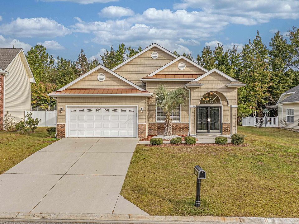 One of a kind CUSTOM home in Sugar Mill! This impeccably maintained one-level home has incredible curb appeal with a beautiful shake and brick front exterior. The split 3 bedroom 2 bath home with covered rear patio welcomes you through a double door entry to high 11-ft ceilings, crown molding, arched doorways and updated luxury vinyl plank flooring. An open formal dining room, great room, and kitchen provide a brilliant space for entertaining family and friends under a soaring 16-ft vaulted ceiling. The kitchen features Stainless appliances, Corian countertops, maple cabinetry, breakfast nook, pantry, recessed lighting, and decorative tile backsplash. The private owners suite features a dramatic tray ceiling, spacious walk-in closet, walk-in tiled shower, Coarian double vanity, garden tub, and sliding door to rear patio. Two additional large bedrooms, each with closet, share a full bath. A two car garage and laundry area complete the plan. Sugar Mill offers low HOA fees and community pool. Enjoy living in a serene setting close to The Market Common, Broadway at the Beach, shopping, dining, championship golf, and the award winning Forestbrook school system.