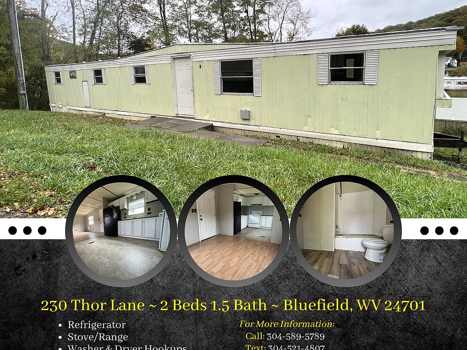230 Thor Lane ~ 2 Beds 1.5 Bath ~ Bluefield, WV 24701 LEASE OPTION (Path to Home Ownership): Initial payment: $1,500 with no payments due until the 1st of the following month! Monthly payment: $650/month. Includes lot rent & curbside trash pick up. or RENTAL: Security Deposit: $650. Can be made in payments if needed. Monthly payment: $650/month. Includes lot rent & curbside trash pick up. Sorry, this home is not HUD approved. Two bedroom, 1.5 bath, single wide mobile home for rent. Located in the quiet small mobile home park Hideaway MHC in Greenvalley, WV. Open floor plan. The bedroom has a half bath off from the bedroom! Washer and dryer hook up. Lots of cabinet space in the kitchen. New paint throughout. New cool seal on the roof to help with the power bill. Private, paved two-car driveway. Christian Management Corporation Office Hours: Mon-Fri 9:00AM-5:00PM & 10:00AM-2:00PM the 1st Saturday of every month You can view THIS property 7 days a week! Most pets welcome with a $300.00 pet fee per pet and signed pet agreement. Maximum 2 pets. No aggressive breeds due to insurance restrictions. Clean, safe, quiet, crime & drug-free are our priorities for our residents! We support Equal-Housing Opportunities! Good people with good, bad, low, or no credit but stable employment or Social Security are welcome. -MUST pass background check -NO evictions in the last 7 years -NO sex offenders Is this property not what you are looking for? View our other available #homes, #mobilehomes, #apartments, and more on our Facebook or our website!