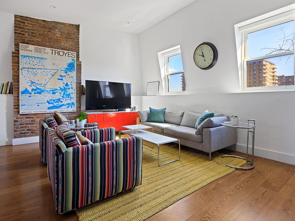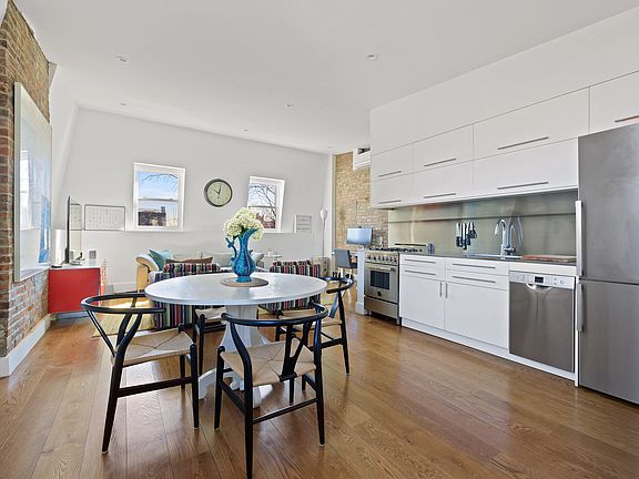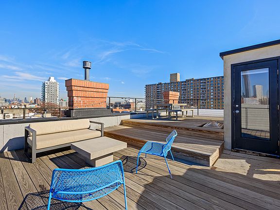 A legal studio with the square footage of a large 1 bedroom, Brooklyn loft living at its finest! The top floor of a converted brownstone in a corner-lot on Washington and Willoughby, 230 Washington Ave, Apt 3 is a legal studio, convertible 1-bedroom, penthouse condo full of architectural detail and a private, multi-tiered roof deck. Currently configured as a studio for ultimate open plan living, the sleeping area is decked out with a wall of closets and two west-facing windows; the alternate floor plan shows how the developer of the 2016 conversion envisioned the space with a wall demarcating a bedroom. Windows in this mansard roof penthouse have western, eastern, and northern exposures with views of Brooklyn and Manhattan and streaming in light all day into every space, including in the sleek bathroom and modern kitchen. A spacious living room accommodates a full furniture set with enough room for an office, and the eat-in kitchen accommodates a large dining table and room for a bar. The apartment has in-unit laundry and central AC/heating. And attractive staircase off the living room leads you to the private roof deck, with attractive, durable wood decking in multiple tiers, setting the stage for epic entertaining. The current owner has furnished the space with a 10-person dining table, a full-sized couch with a coffee table and 2 chairs, a smoker, and a grill, with plenty of room to roam. The 360 views of Brooklyn and Manhattan from the roof set an impressive scene. 230 Washington Ave is a 3-unit, self-managed condominium in Clinton Hill's most prime location. On Willoughby, it's a scenic commute to Fort Greene Park on a no-car-thru street. Myrtle and Dekalb Aves offer some of the area's best dining, and the G train is conveniently located nearby, as are multiple Citibike stations.