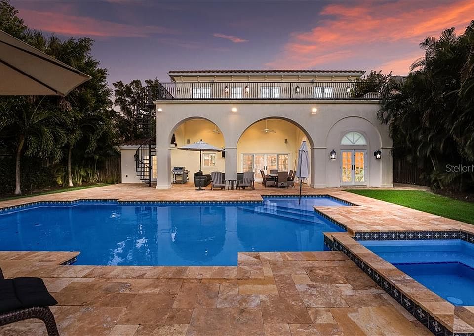 Enjoy resort style living at this 4BD+den/4BA waterfront home on the north end of Anna Maria Island! The front entry is most impressive with a large paved driveway, classic landscaping with lighting, front patio to welcome friends/family, and paved walkway to the french doors. The grand living space is open and bright with a decorative gas fireplace, vaulted ceilings, and custom oak staircase with rod iron railing. You will be most impressed with the well equipped kitchen offering granite counters, kitchen aid professional grade appliances, and a large island w/ gas stove, wine fridge , and counter seating. Serving meals is so easy whether you dine indoors in the dining room or alfresco through the sliding doors leading to the large covered patio overlooking the fabulous pool and canal. The first floor also offers an interior laundry room, two bedrooms, two bathrooms, and a den that you could make into an office, pool room, or lounge area! Retreat upstairs after a day at the beach where the family can entertain in the enormous family room with built-in wet bar! The master suite is on the second floor and offers wood flooring, large custom built walk-in closet, and a gigantic en suite bathroom with jacuzzi tub, glassed shower, and dual sinks with granite counter tops! You have an additional bedroom and bathroom on the second floor and they all open up with french doors to an opened terrace with stunning views of your canal, oversized pool, and sunset skies. Take the custom iron winding staircase down to your backyard oasis which offers travertine tile, heated saline pool/spa, wood boat dock with 10,000 lb lift, floating dock, concrete seawall, and views you will never grow old of! Additional features include 2 car garage w/ impact door, hurricane impact windows & doors, speaker and surround sound system, alarm system, and fenced yard. All that this island home has to offer PLUS it is located 2 blocks to the beach and a very short walk to Pine Ave for dining and shopping! Sold turnkey furnished with future rentals in place, make this island oasis yours today! 3D tour available