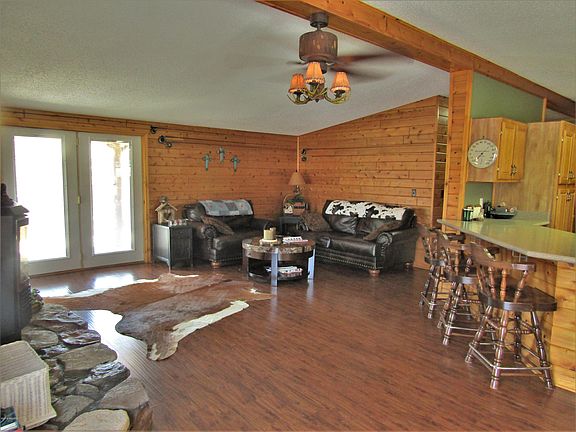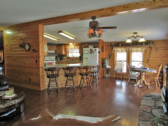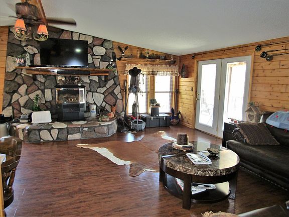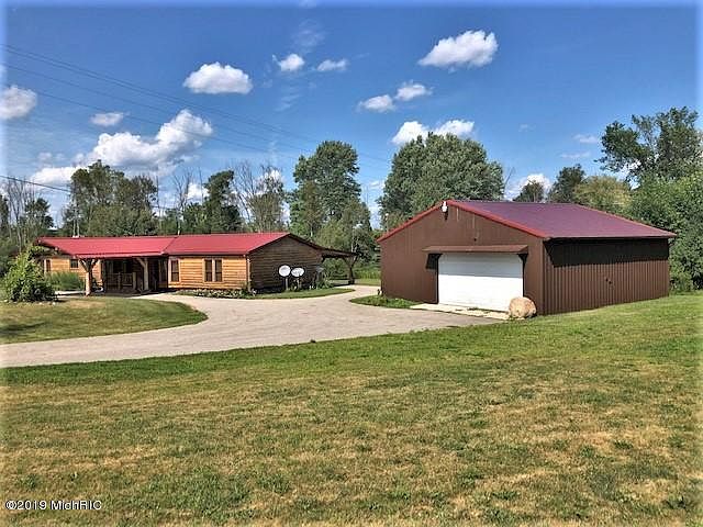 Conveniently located just a mile south of Barryton. This cute 2,000+ sqft log home has a wrap around deck with beautiful views of the river. With over 800 ft of private waterfront it's a perfect spot to come home to and relax, fish or take a walk on the 5 acres. Home features 3 bedrooms, 2 full baths, kitchen with breakfast bar, 2 living areas, one has a gas log stove to take the chill off on cold nights. Also includes a covered front porch with carport, a covered back deck and carport. NO maintenance metal roofing. 32X32 pole barn for all your toys and a workspace. A generator for the home as well as a sauna house to warm up in after a cold day riding the trails. This home is move in ready! Call today for a showing!