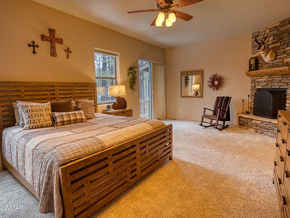 TRUE pride of ownership. This FULLY FURNISHED home is in the highly desired gated Pineridge subdivision. Close to 3 golf courses, shopping and eateries. Only 30 minutes to Sunrise Ski Resort. This 3 bed, 2.5 baths PLUS a large loft for a game room, TV or Den with soaring large windows, ceiling to floor stacked stone fireplace, open concept, vaulted ceiling with T&G, wood log accents and wood floors in the living room. 2 fireplaces, w/ one gas and the other wood with a gas starter. Huge Master, downstairs, with a fireplace and plenty of room for a desk or sitting area. Private back deck off of the Master. Another large wrap around deck at the front of the home leading back to custom firepit in the backyard that is fully fenced. Circular drive in the front. Read MORE... The downstairs has a Great Room, dining area and open kitchen with SS appliances and lots of counter space and cabinets. The windows and fireplace are grand and amazing. The home also has a large pantry and other storage.