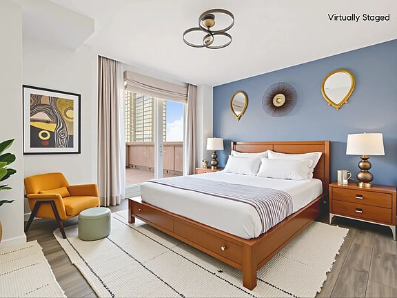 The King-sized primary suite enjoys direct access to the terrace, two customized closets, and a luxurious spa-like en-suite bathroom featuring an oversized glass shower and double vanity. Two additional sun-filled bedrooms provide generous storage and skyline views one with its own en-suite bath. Pet considered case-by-case.