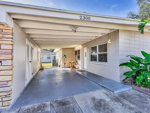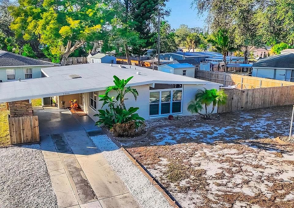 Under contract-accepting backup offers. Charming mid-century modern home located on an oversized corner lot with thoughtful updates and fantastic outdoor living. This 3-bedroom, 2-bath home features a bright great-room layout with polished terrazzo floors and warm mid-century character throughout. The updated kitchen includes French-cream cabinetry, solid-surface counters, ceramic backsplash, and stainless steel appliances, with an adjoining dining area and a flexible all-seasons Florida sunroom. Major improvements were completed in 2019, including a new roof, updated plumbing, and newer A/C. Most recently (2025) the home has new exterior paint, new front windows, new backyard fence (2024) and a new garbage disposal—making this home truly move-in ready. The fenced in backyard is ideal for relaxing or entertaining with a fire pit, paver patio, and plenty of room for pets. Storage is abundant, with a backyard shed that stays, plus covered storage under the carport. Additional features: optional $10 HOA, access to the Bayshore Gardens recreation center with pool, park, marina and boat ramp, home is NOT located in a flood zone, and conveniently located near shopping, dining, and the Gulf beaches. This lovingly maintained mid-century home is ready for its next owners. Set up your showing today!